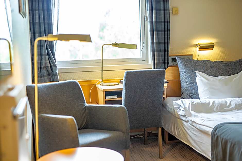 The double room is furnished with a desk and a seating area. The unit has 2 beds.